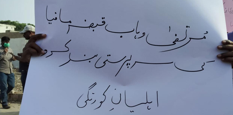 احتجاجی مظاہرین نے ہاتھوں میں پلے کارڈ اٹھا رکھے تھے، جن پر مرتضیٰ وہاب کی قبضہ مافیا کی مبینہ سرپرستی کرنے کے خلاف نعرے درج تھے۔