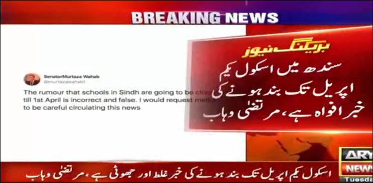 تفصیلات کے مطابق سندھ حکومت کے ترجمان مرتضیٰ وہاب نے سماجی رابطے کی ویب سائٹ ٹوئٹر پر اپنے بیان میں کہا سندھ میں یکم اپریل تک اسکولوں کے بند ہونے کی افواہیں غلط اور جھوٹی ہے، میڈیا سے درخواست کروں گا کہ وہ ایسی خبروں سے محتاط رہیں۔