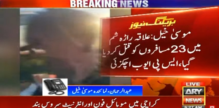 کوئٹہ: موسیٰ خیل کے علاقے راڑہ شم میں 23 مسافروں کو گاڑیوں سے اتار کر قتل کر دیا گیا۔
