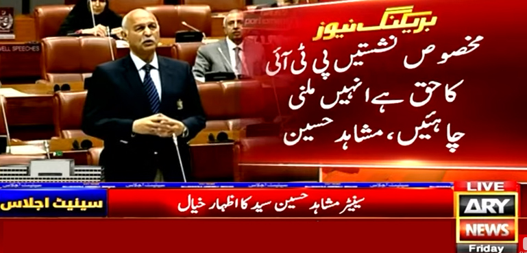 اے آر وائی نیوز کے مطابق سینیٹ کے اجلاس میں اظہار خیال کرتے ہوئے ن لیگ سے تعلق رکھنے والے سینیٹر مشاہد حسین سید نے کہا ہے کہ مخصوص نشستیں پی ٹی آئی کا حق ہیں اور انہیں ملنی چاہئیں۔