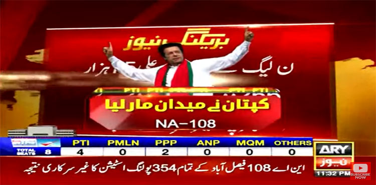 تفصیلات کے مطابق این اے 108 کے تمام 354 پولنگ اسٹیشن کے غیر حتمی وغیر سرکاری نتائج کے مطابق پاکستان تحریک انصاف کے چیئرمین عمران خان 99841 ووٹ لے کر کامیاب ہوگئے، مسلم لیگ ن کے عابد شیر علی 75266 ووٹ حاصل کر کے دوسرے نمبر پر رہے۔