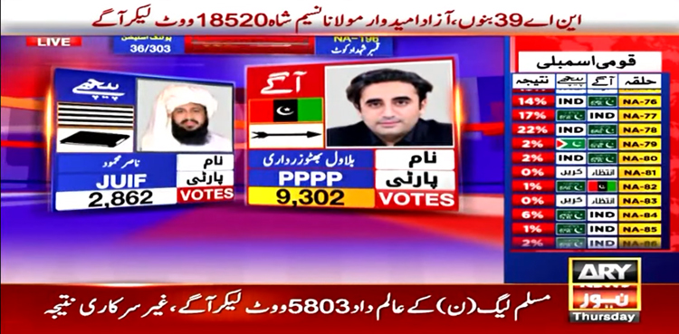 غیر حمتی و غیر سرکاری نتیجے کے مطابق بلاول بھٹو زرداری 18781 ووٹ لے کر آگے جبکہ ناصر محمود سومرو 6477 ووٹ کے ساتھ دوسرے نمبر پر ہیں۔