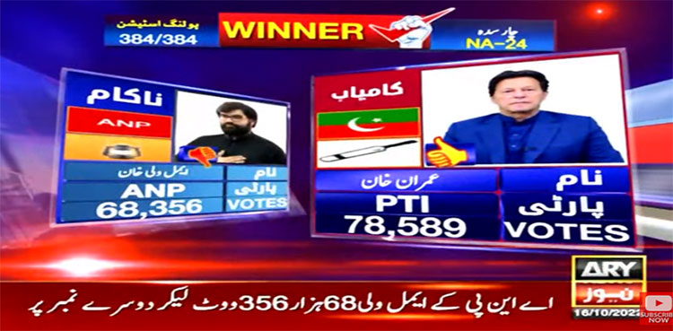 این اے 24 کے تمام 384 پولنگ اسٹیشن کے غیر سرکاری اور غیرحتمی نتائج کے مطابق چیئرمین پاکستان تحریک انصاف عمران خان 78589 ووٹ لے کر کامیاب ہوگئے جبکہ ان کے مدمقابل عوامی نیشنل پارٹی کے ایمل ولی خان 68ہزار356ووٹ کے دوسرے نمبر پر رہے۔