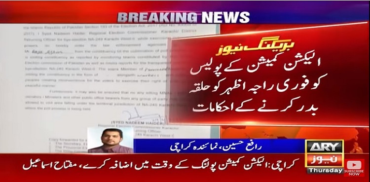 الیکشن کمشنر سندھ اعجازانور چوہان کی جانب سے جاری بیان میں کہا گیا کہ میڈیا کے ذریعے علم میں آیا کہ کچھ سیاسی شخصیات حلقے میں موجود ہیں جس پر ڈی آرا و این اے 249 نےان ارکان اسمبلی کے خلاف احکامات جاری کئے، ولنگ کے دوران رکن اسمبلی نہیں آسکتے۔