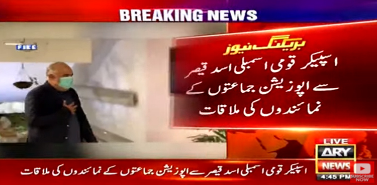 اے آر وائی نیوز کے مطابق اسپیکر قومی اسمبلی اسد قیصر سے اپوزیشن جماعتوں کے نمائندوں نے اسپیکر چیمبر میں ملاقات کی، ملاقات میں قومی اسمبلی اجلاس کے قوانین سے متعلق مشاورت کی گئی۔