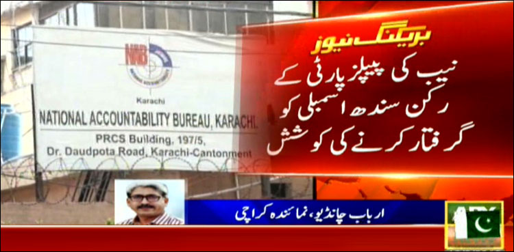 نمائندہ اے آر وائی ارباب چانڈیو کے مطابق نیب کی ٹیم نے پیپلزپارٹی کےرکن سندھ اسمبلی کوگرفتارکرنےکی کوشش کی مگر وہ ناکام رہے، پیپلزپارٹی رہنماؤں نے بھی رکن اسمبلی کو روکے جانے کی تصدیق کردی۔