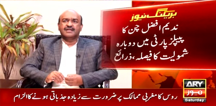 لاہور: وزیر اعظم عمران خان کے سابق ترجمان ندیم افضل چن نے پاکستان پیپلز پارٹی میں دوبارہ شمولیت کا فیصلہ کر لیا ہے۔