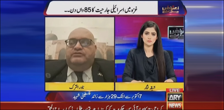 ڈپٹی ہیڈ آف مشن فلسطین نادر الترک نے اے آر وائی نیوز کے پروگرام اعتراض ہے میں گفتگو کرتے ہوئے کہا کہ فلسطین بہت جلد قابض اسرائیل سے جان چھڑا لے گا، ہم مسجد اقصیٰ کو بہت جلد اسرائیلی بربریت سے بچا لیں گے۔