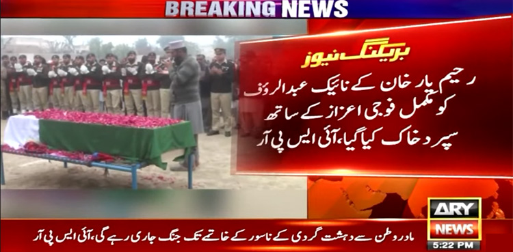فرض کی انجام دہی کے دوران جام شہادت نوش کرنے والے نائیک عبدالرؤف کو مکمل فوجی اعزاز کے ساتھ آبائی علاقے میں سپرد خاک کردیا گیا۔