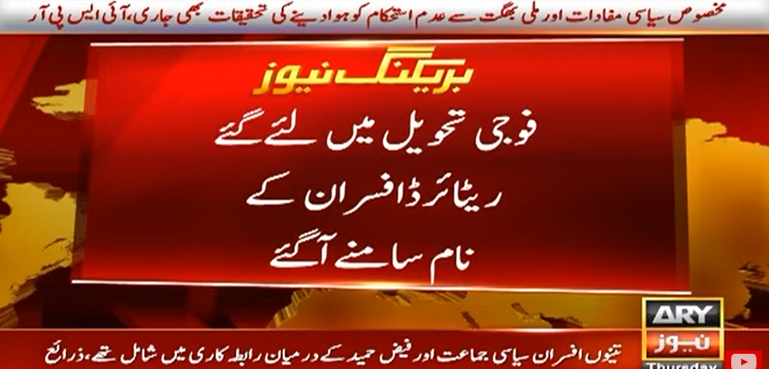 ذرائع کا کہنا ہے کہ تحویل میں لیے گئے افسران میں بریگیڈیئر (ر) غفار اور بریگیڈیئر(ر) نعیم اور کرنل (ر) عاصم شامل ہیں۔