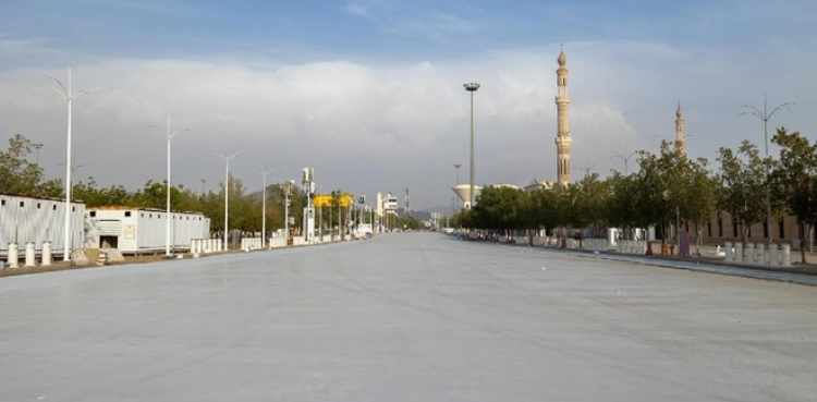 عرفات کے علاقے میں گرمی کی شدت کم کرنے کے لیے مسجد نمرہ کے ارد گرد سڑکوں پر سفید رنگ کردیا گیا۔