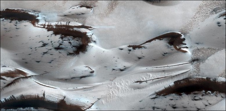 ایک تصویر ایسی بھی ہے جس کو دیکھ کر ماہرین نے مریخ پر پانی کی موجودگی کا امکان ظاہر کیا کیونکہ ریت کے ٹیلوں کی مٹی میں نمی کے اثرات تھے۔