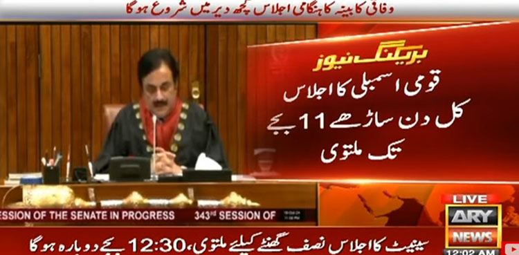اے آر وائی نیوز کے مطابق سینیٹ کا اجلاس رات ساڑھے 12 تک کے لے ملتوی کیا گیا ہے اس سے قبل اجلاس بار بار ملتوی ہونے کے بعد رات گیارہ بجے کے قریب شروع ہوا تھا۔