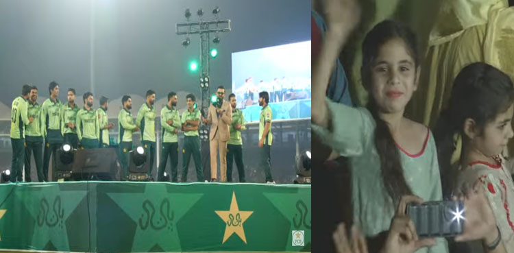 شائقین کی بڑی تعداد نیشنل اسٹیڈیم کراچی کی افتتاحی تقریب میں موجود تھی، اس موقع پر نیشنل اسٹیڈیم میں قومی ٹیم کےکھلاڑی بھی اسٹیج پر آئے جبکہ چیمپئنز ٹرافی کی جرسی کی رونمائی بھی کی گئی۔