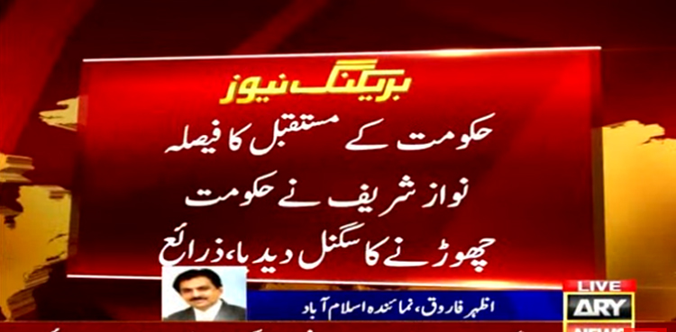 تفصیلات کے مطابق حکومت کے مستقبل کا فیصلہ ہوگیا ،ذرائع کا کہنا ہے کہ مسلم لیگ ن کے قائد نواز شریف نے حکومت چھوڑنے کا سگنل دے دیا ہے۔