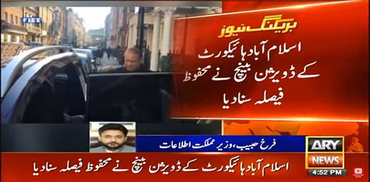 اے آر وائی نیوز سے گفتگو کرتے ہوئے وزیرمملکت برائے اطلاعات فرخ حبیب نے فیصلے پر ‏ردعمل میں کہا کہ نوازشریف کوسزائیں مکمل ٹرائل کےبعددی گئیں نوازشریف کےپاس اب کوئی ‏آپشن نہیں بچا انہیں واپس آکر جیل جانا پڑے گا۔