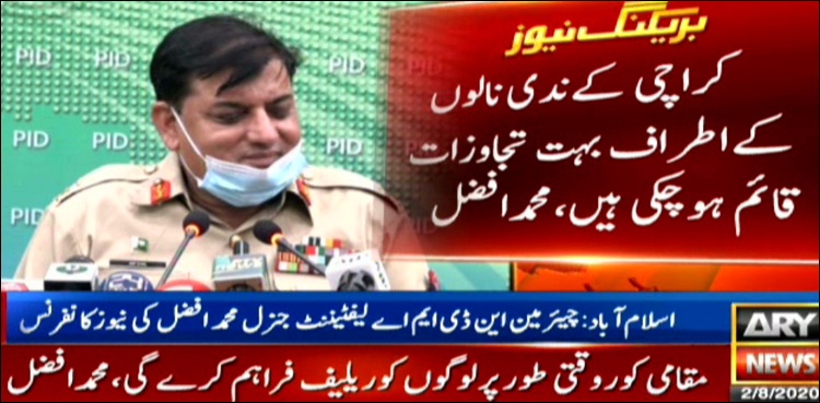 نمائندہ اے آر وائی نیوز کے مطابق چیئرمین این ڈی ایم اےمحمدافضل نے کراچی کی صورت حال پر اسلام آباد میں میڈیا کو بریفنگ دی اور بتایا کہ کراچی میں گزشتہ دنوں ایک گھنٹے میں 83 ملی میٹر بارش ہوئی، وزیراعظم کی ہدایت پر جب کراچی پہنچا تو اُس وقت تک پانی کی نکاسی ہوچکی تھی۔