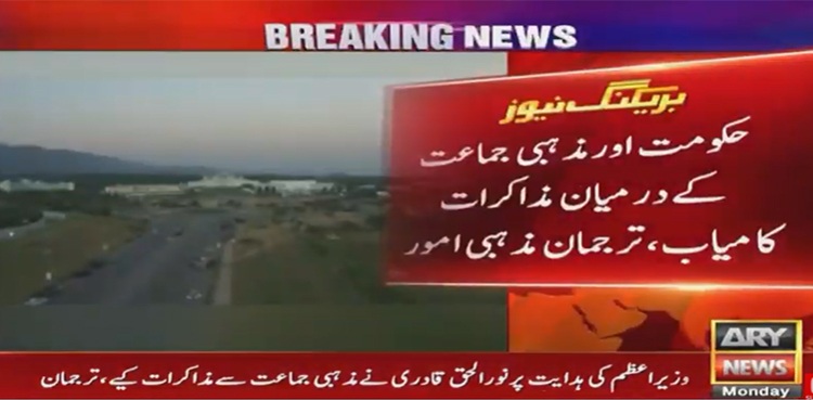 حکومت اور مذہبی جماعت کےدرمیان مذاکرات کامیاب ہوگئے جس کے بعد مظاہرین کچھ دیر میں فیض آباد دھرنا ختم کرنے کا اعلان کریں گے۔