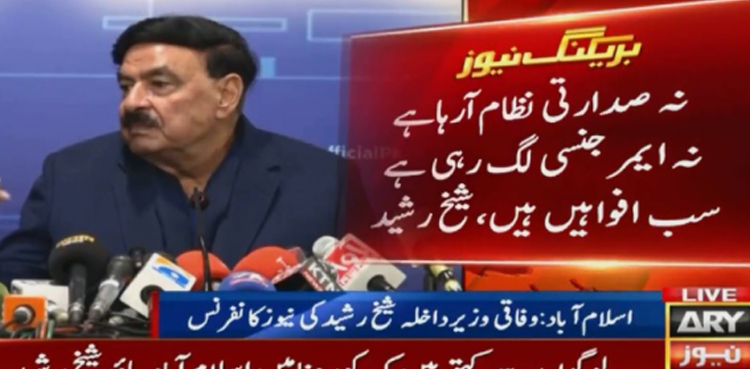 ملک میں صدارتی نظام یا ایمرجنسی کی خبروں پر وفاقی وزیر کا کہنا تھا کہ بطوروزیرداخلہ کہتاہوں کوئی صدارتی نظام نہیں آرہانہ ایمرجنسی لگ رہی ہے، نہ کوئی ڈیل اور نہ ڈھیل دی جارہی ہے اورنہ عدم اعتماد آرہی ہے، کسی کو عدم اعتماد کا شوق ہےتو پوراکرلے،بندے ان کو ہی لانے ہیں۔
