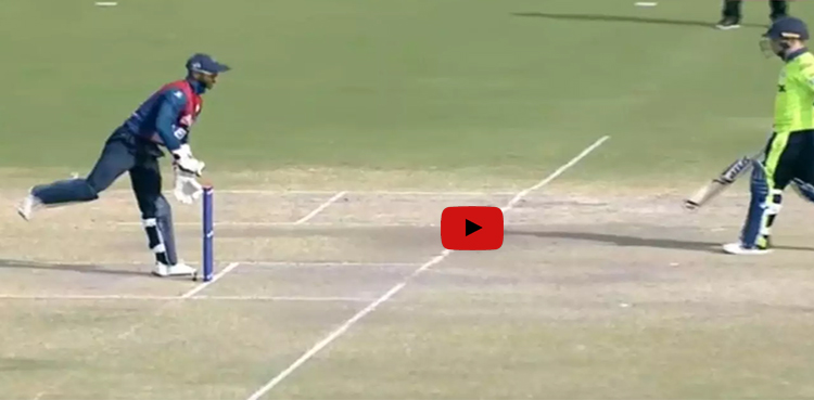 ہوا کچھ یوں کہ نیپالی بالر کمال سنگھ کی گیند پر آئرش بلے باز رن بنانے کے لیے بھاگے تو بولر اس کوشش کو ناکام بنانے کے لیے گیند کی طرف لپکے۔