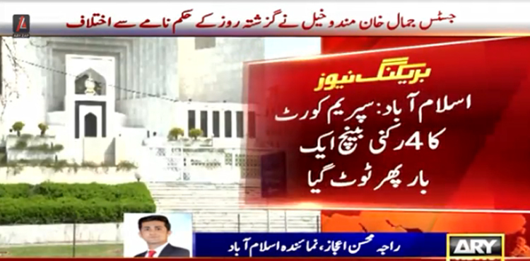 جسٹس جمال خان مندوخیل بینچ سے علیحدہ ہوگئے، انھوں نے کل کے حکم نامے سے اختلاف کرتے ہوئے کہا کہ سماعت کا حکم نامہ عدالت میں نہ تو لکھوایا گیا نہ مجھ سےمشاورت کی گئی۔