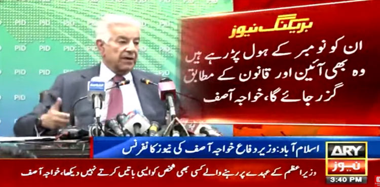 نیوز کانفرنس کرتے ہوئے خواجہ آصف نے کہا کہ میرے پاس وزیر دفاع کا قلمدان ہے، میرا فرض بنتا ہے کہ جب فوج کے خلاف مہم چلائی جائے تو ادارے کا دفاع کروں، ہم نہیں چاہتے کہ ایسا ہاتھ ڈالا جائے جس سے ریلیف ملے ، قانون کے مطابق ایسا ہاتھ ڈالا جائے کہ انہیں ریلیف نہ ملے۔