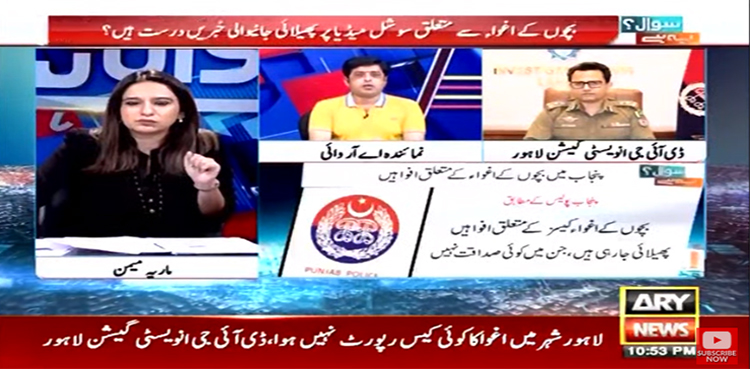 اے آر وائی نیوز کے پروگرام سوال یہ ہے میں گفتگو کرتے ہوئے انہوں نے کہا کہ لاہور میں اغوا کا کوئی کیس رپورٹ نہیں ہوا سوشل میڈیا پر افواہوں کی تحقیقات کیں تو وہ کسی اور ملک کی تھیں۔