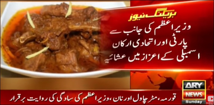 انہوں نے بتایا تھا کہ ماضی کے برعکس عشائیے کے اخراجات وزیر اعظم عمران اپنی جیب سے ادا کریں گے اور مہمانوں کو کھانے میں قورمہ، مٹرل چاول اور نان پیش کیے جائیں گے۔
