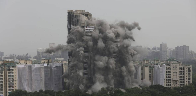 بھارتی میڈیا رپورٹ کے مطابق ریاست اترپردیش میں واقع نوائیڈہ میں واقعہ غیر قانونی طور پر تعمیر بلند و بالا رہائشی عمارت کو دھماکا خیزمواد سے گرایا گیا ہے، 103 میٹر بلند جڑواں عمارتیں کو گرانے کیلئے 3700 کلو بارودی مواد استعمال کیا گیا جس سے دونوں عمارتیں صرف 12 سیکنڈز میں زمین بوس ہوگئی۔