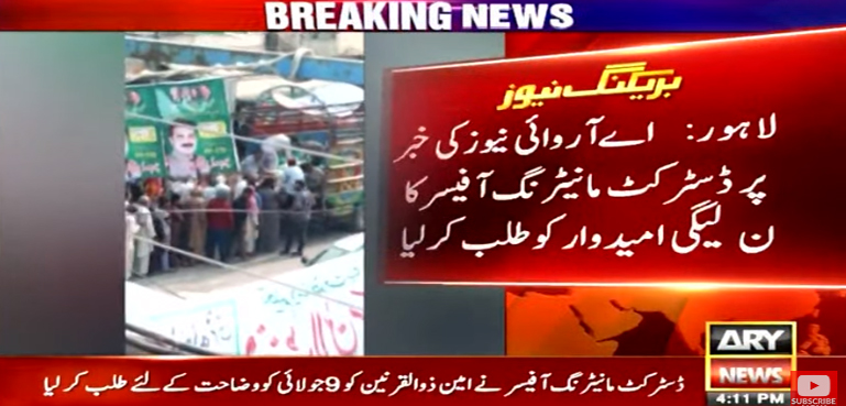 واضح رہے کہ اے آر وائی نیوز سے دو روز قبل خبر نشر کی گئی تھی کہ یوٹیلٹی اسٹور کے ٹرک ن لیگی امیدوار کے دفاتر پہنچا دیے گئے ہیں جہاں سے عوام میں الیکشن کمیشن ضابطہ اخلاق کی خلاف ورزی کرتے ہوئے اشیائے خور ونوش تقسیم کی جارہی ہیں۔
