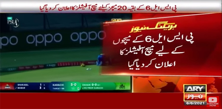 پاکستان کرکٹ بورڈ نے ایچ بی ایل پاکستان سپر لیگ 6 کے ابوظہبی میں شیڈول بقیہ 20 میچز کے لیے میچ آفیشلز کا اعلان کردیا ہے۔ یہ میچز 9 سے 24 جون تک شیخ زید کرکٹ اسٹیڈیم میں کھیلے جائیں گے۔