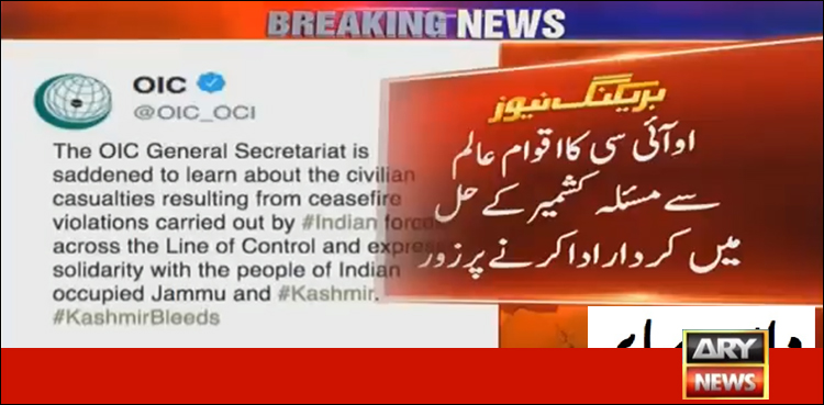 تفصیلات کے مطابق مقبوضہ کشمیر میں بھارتی مظالم پر پاکستان کی سفارتی کوششوں کا اثر سامنے آنے لگا کیونکہ او آئی سی نے مقبوضہ کشمیر میں بھارتی فوج کی اضافی تعیناتی پر تشویش کا اظہار کردیا۔