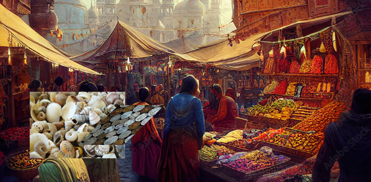 برصغیر میں مختلف ریاستوں میں کوڑیوں کے علاوہ سونے، چاندی اور تانبے کے سکّے کسی نہ کسی شکل میں تجارت اور خرید و فروخت کے لیے رائج رہے ہیں اور مغلیہ عہد بھی کرنسی کا یہ نظام اسی طرح جاری رہا۔ صدیوں پہلے کوڑیاں بازار اور ہر جگہ مالی لین دین کے لیے استعمال ہوتی تھیں۔ یہ کوڑیاں دراصل سمندر سے نکالی جانے والی سیپیوں کی ایک خاص قسم تھی جو اب گئے وقتوں کی بات ہے۔