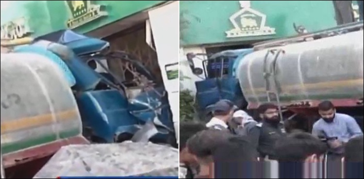 تفصیلات کے مطابق نارتھ ناظم آباد کٹی پہاڑی سے اترتے ہوئے 3ہزار گیلن پانی سے بھرا واٹر ٹینکر کئی گاڑیوں کو روندا ہوا نجی بینک میں جاگھسا، خوفناک ٹریفک حادثے میں ایک شخص جاں بحق پانچ افراد زخمی ہوگئے۔