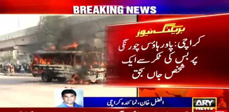 تفصیلات کے مطابق کراچی میں ٹریفک کا افسوسناک حادثہ پیش آیا ہے، جہاں پاورہاؤس چورنگی پر بس کی ٹکر سے ایک شخص جاں بحق ہوگیا ، اس موقع پر مشتعل افراد نے بس کوآگ لگادی ، جس کے بعد فائربریگیڈ طلب کرلی گئی۔