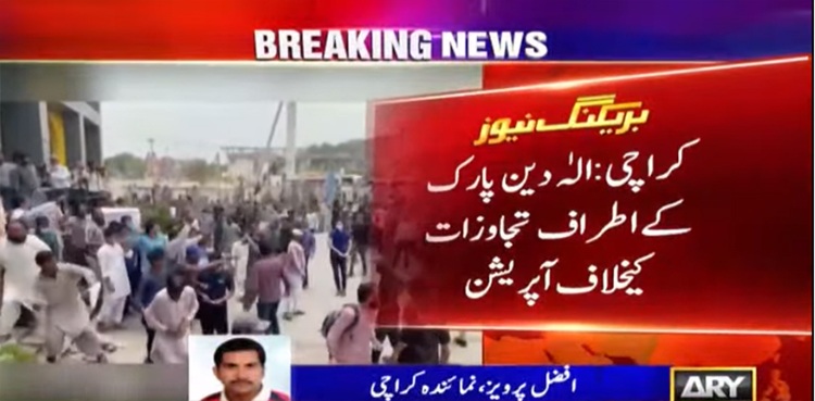 کراچی: الہٰ دین پارک کےاطراف تجاوزات کیخلاف آپریشن پرتشدد ہوگیا، پولیس اور مظاہرین کے درمیان ہونے والی جھڑپوں کے باعث علاقہ میدان جنگ بن گیا۔
