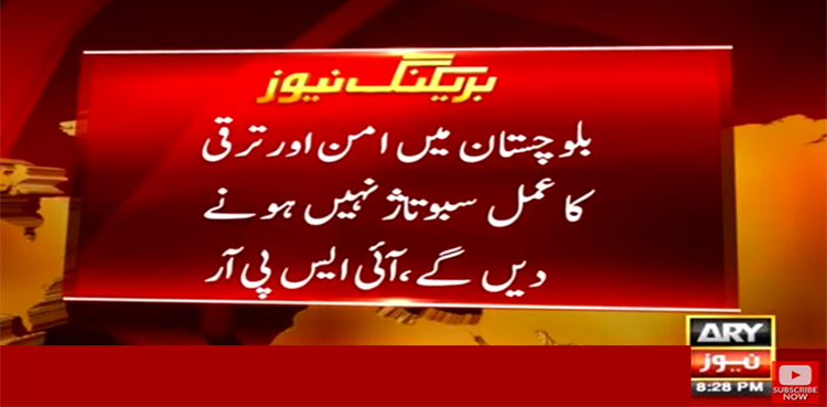 آئی ایس پی آر کا کہنا ہے کہ دہشت گرد اور سہولت کاروں کیخلاف آپریشن جاری رہےگا، بلوچستان میں امن اور ترقی کا عمل سبوتاژنہیں ہونےدیں گے۔