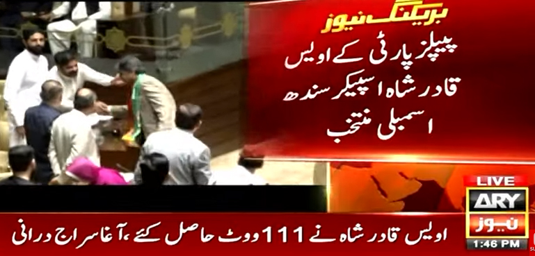 پاکستان پیپلز پارٹی کے نامزد امیدوار اویس شاہ اسپیکر سندھ اسمبلی منتخب ہو گئے ہیں انہوں نے 111 ووٹ حاصل کیے۔