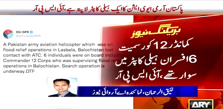 A Pakistan army aviation helicopter which was on flood relief operations in Lasbela, Balochistan lost contact with ATC. 6 individuals were on board including Commander 12 Corps who was supervising flood relief operations in Balochistan. Search operation is underway.DTF