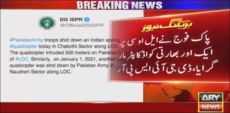 The quadcopter intruded 500 meters on Pakistan’s side of #LOC. Similarly, on January 1, 2021, another Indian quadcopter was shot down by Pakistan Army in Nausheri Sector along LOC.— DG ISPR (@OfficialDGISPR) January 2, 2021