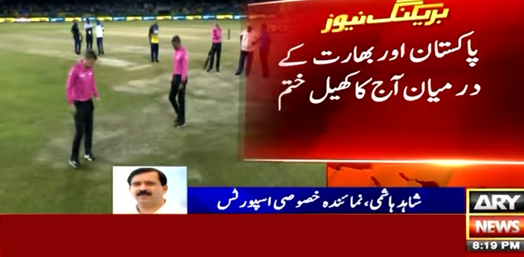 سُپر فور مرحلے کے تیسرے میچ میں بھارت کی پاکستان کے خلاف بیٹنگ جاری تھی کہ بادل برس پڑے جس کے باعث میچ روک دیا گیا۔