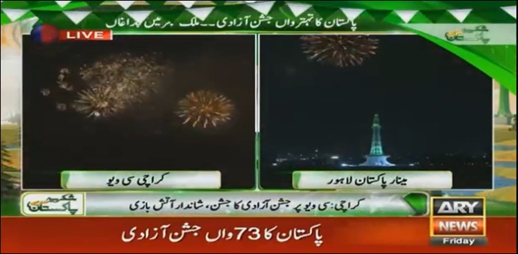 کراچی / لاہور / پشاور / کوئٹہ / اسلام آباد: ملک بھر میں رات 12 بجتے ہی تمام شہروں میں شاندار آتش بازی اور چراغاں کر کے 73ویں آزادی کا جشن منایا گیا۔