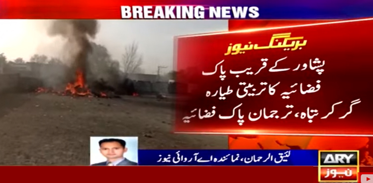 پشاور کے قریب پاک فضائیہ کا تربیتی طیارہ گر کر تباہ ہوگیا جس کے نتیجے میں دونوں پائلٹ شہید ہوگئے۔