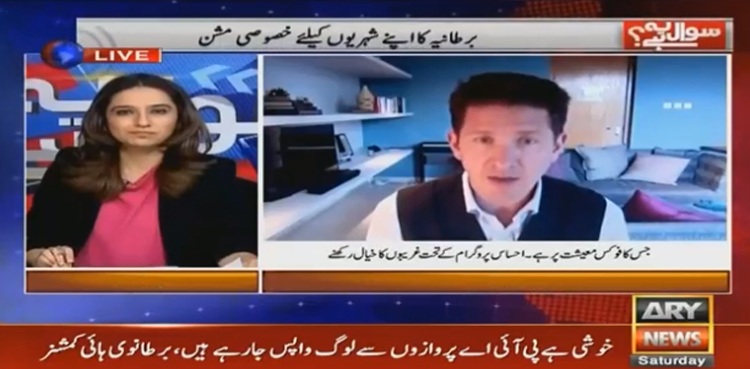 اے آر وائی نیوز کے پروگرام سوال یہ ہے میں گفتگو کرتے ہوئے برطانوی ہائی کمشنر کا کہنا تھا کہ 4اپریل سے پی آئی اے کی 23پروازیں برطانیہ گئیں، پروازوں میں ساڑھے7 ہزار افراد نے سفر کیا، ہم 10مزید برطانوی چارٹرڈ پروازوں کا اہتمام کررہے ہیں۔ پروازیں لاہور اور اسلام آباد سے ہیتھرو اور مانچسٹر جائیں گی۔