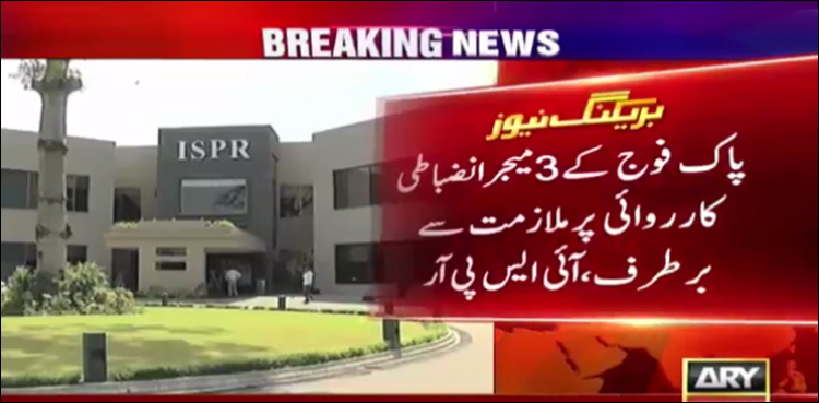 تفصیلات کے مطابق پاک فوج کے شعبہ تعلقات عامہ کے ادارے آئی ایس پی آر نے کہا ہے کہ پاک فوج کے 3میجر انضباطی کارروائی پرملازمت سے برطرف کردیا گیا ہے ، تینوں افسران ڈسپلن کی خلاف ورزی کےمرتکب پائے گئے۔