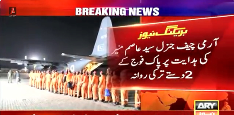 پاک فوج کے ترجمان نے بتایا کہ امدادی ٹیمیں 6اور 7 فروری کی درمیانی رات پاک فضائیہ کے خصوصی طیارے کے ذریعے ترکی کے شہر اڈانا کیلئے روانہ ہوئیں۔