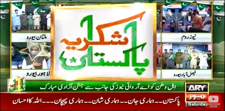 جشن آزادی کی مناسب سے شہر شہر جیوے پاکستان کے نعروں کی گونج اور سبز ہلالی پرچموں کی بہار ہے جبکہ ہر شخص نےقومی نغمے سُن کر اور پاکستان کے حق میں‌ نعرے لگا کر وطن سے اپنی محبت کا اظہار کیا۔