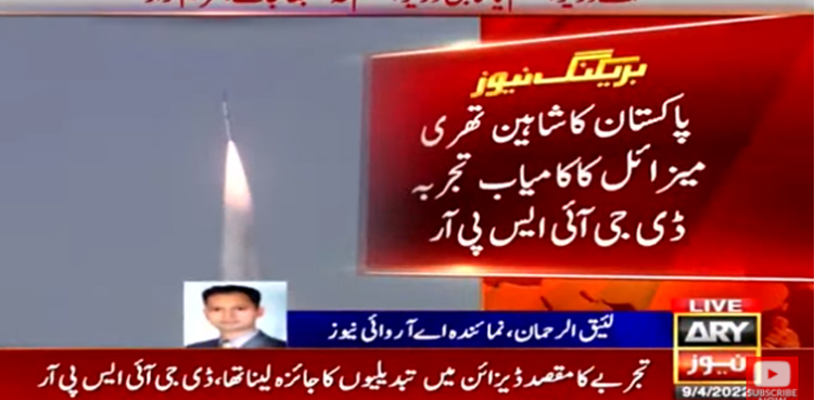 تفصیلات کے مطابق پاک فوج کے شعبہ تعلقات عامہ (آئی ایس پی آر) کے ڈائریکٹر جنرل میجر جنرل بابر افتخار نے سماجی رابطے کی ویب سائٹ ٹوئٹر پر اہنے پیغام میں کہا کہ پاکستان نے شاہین تھری بیلسٹک میزائل کا کامیاب تجربہ کرلیا۔