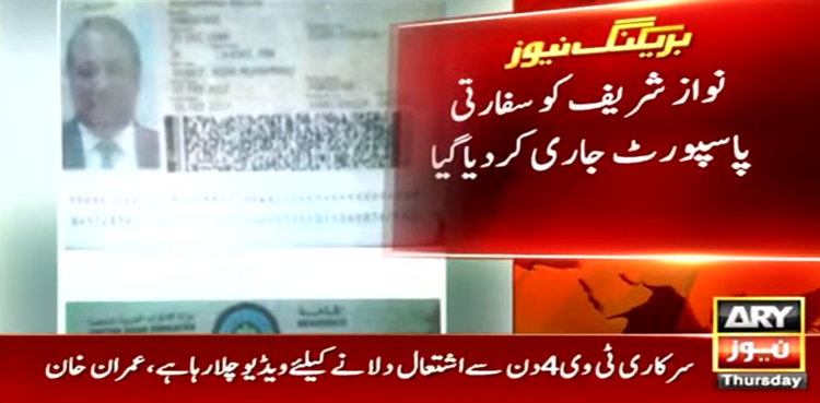 ذرائع کے مطابق حکومتِ پاکستان نے نواز شریف کو سفارتی پاسپورٹ جاری کر دیا، وزارت خارجہ کی حتمی منظوری کے بعد سفارتی پاسپورٹ جاری کیا گیا۔