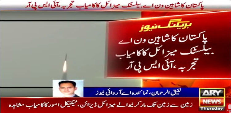 پاک فوج کے شعبہ تعلقات عامہ (آئی ایس پی آر) کے مطابق پاکستان نے شاہین ون اے بیلسٹک میزائل کا کامیاب تجربہ کرلیا، زمین سے زمین تک مار کرنے والے میزائل کا ڈیزائن، ٹیکنیکل امور کا کامیاب مشاہدہ کیا گیا۔
